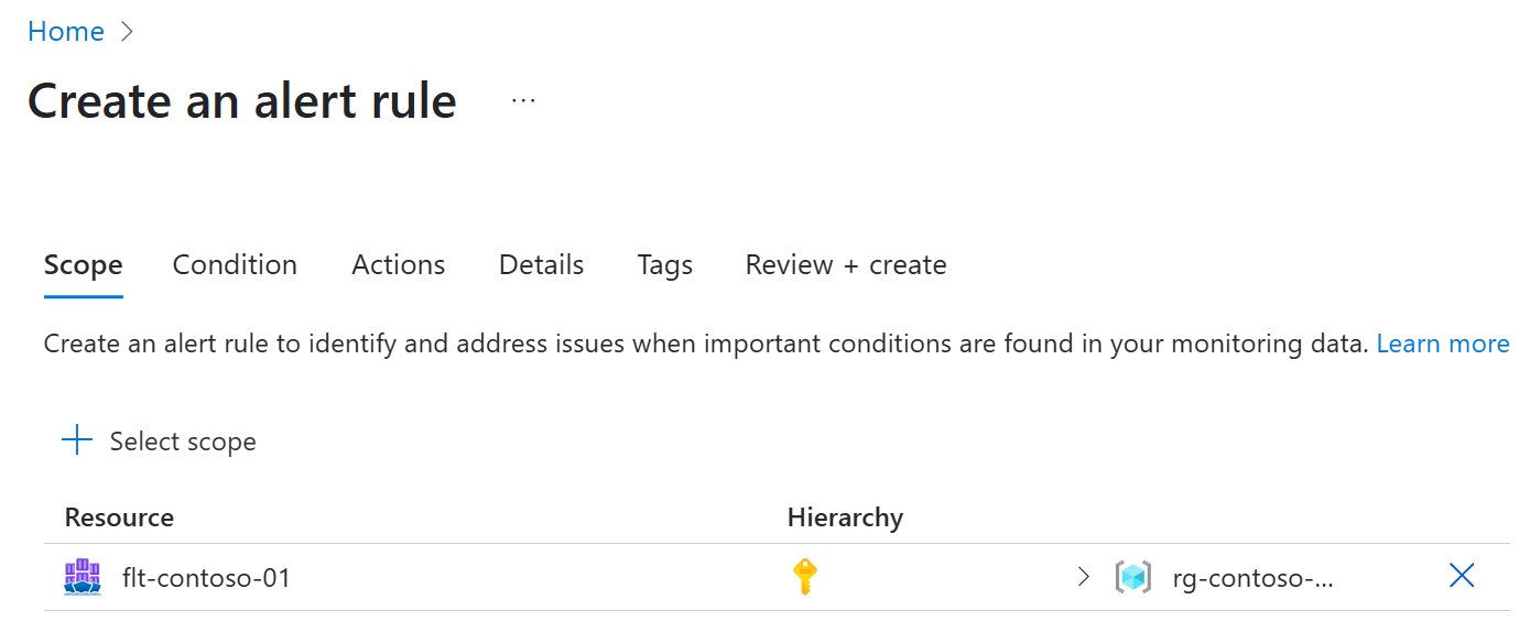 На экране "Создание правила генерации оповещений " выберите +Выбрать область и в колонке "Выбор ресурса " перейдите к ресурсу Fleet Manager, выбрав подписку Azure и группу ресурсов, в которой она находится.