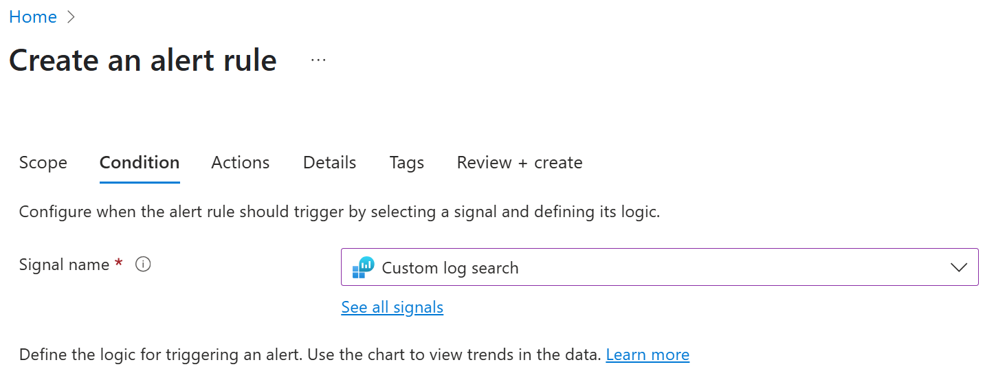 Перейдите на вкладку Условие и в раскрывающемся списке имени сигнала выберите Пользовательский поиск по журналам. Панель "Журналы" загружается на правой стороне экрана.