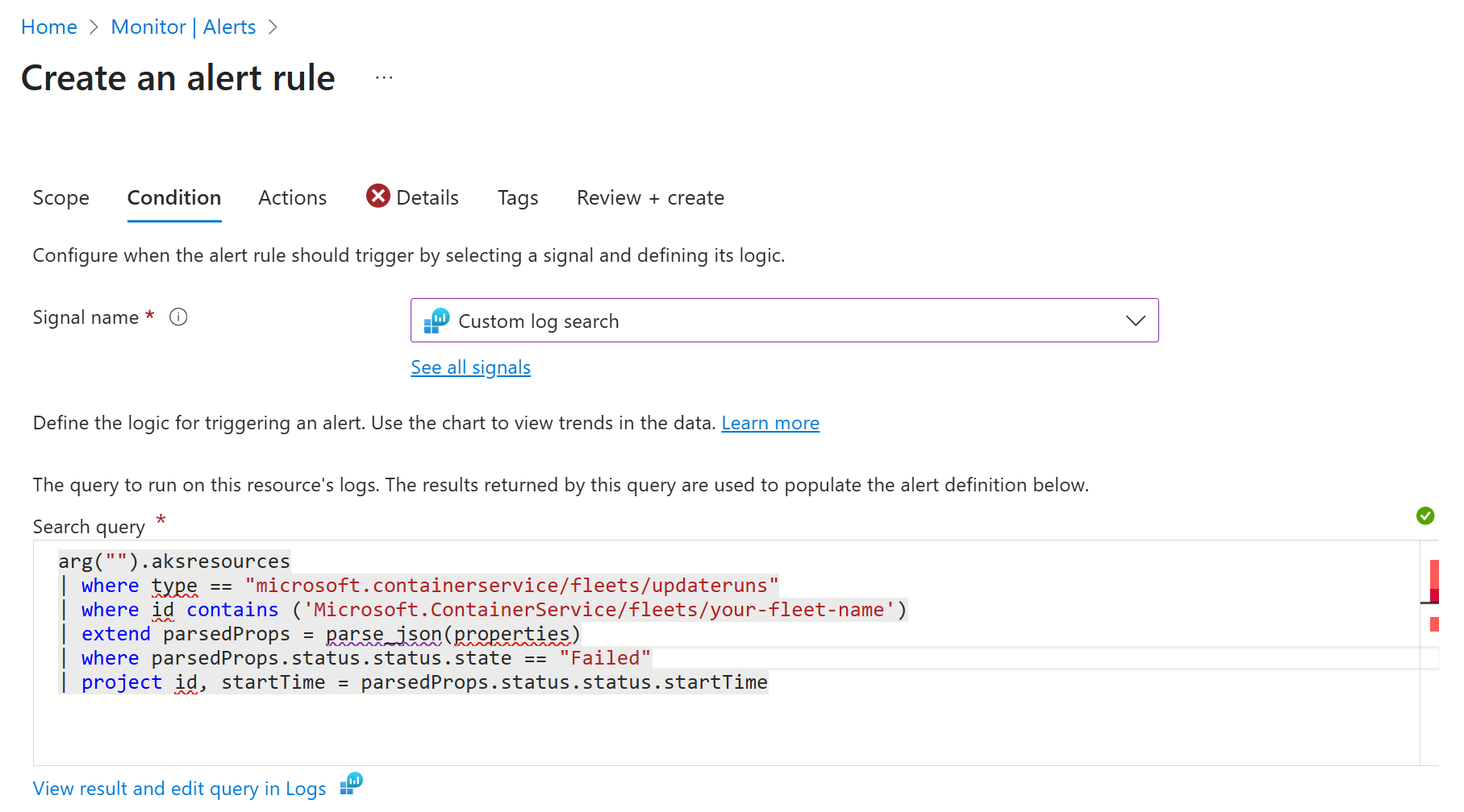 aksresourcesс помощьюarg("").. Оставшийся синтаксис не отличается от синтаксиса запросов, использованных ранее в этой статье.arg("").aksresources | where type == "microsoft.containerservice/fleets/updateruns" | where id contains ('Microsoft.ContainerService/fleets/your-fleet-name') | extend parsedProps = parse_json(properties) | where parsedProps.status.status.state == "Failed" | project id, startTime = parsedProps.status.status.startTimeПосле того как вас устроят результаты, возвращаемые запросом, выберите "Продолжить редактирование оповещения", чтобы закрыть панель "Журналы". Запрос автоматически вставляется в поле запроса поиска . При желании вы можете продолжить его редактирование.