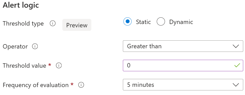 Прокрутите вниз, пока не увидите логику оповещения, используя поле формы для определения условий, которые необходимо активировать оповещение. Рекомендуется использовать статическое пороговое значение, задав значение 0, а оператор — "Больше". Настройте частоту в соответствии с предпочитаемым периодом времени.