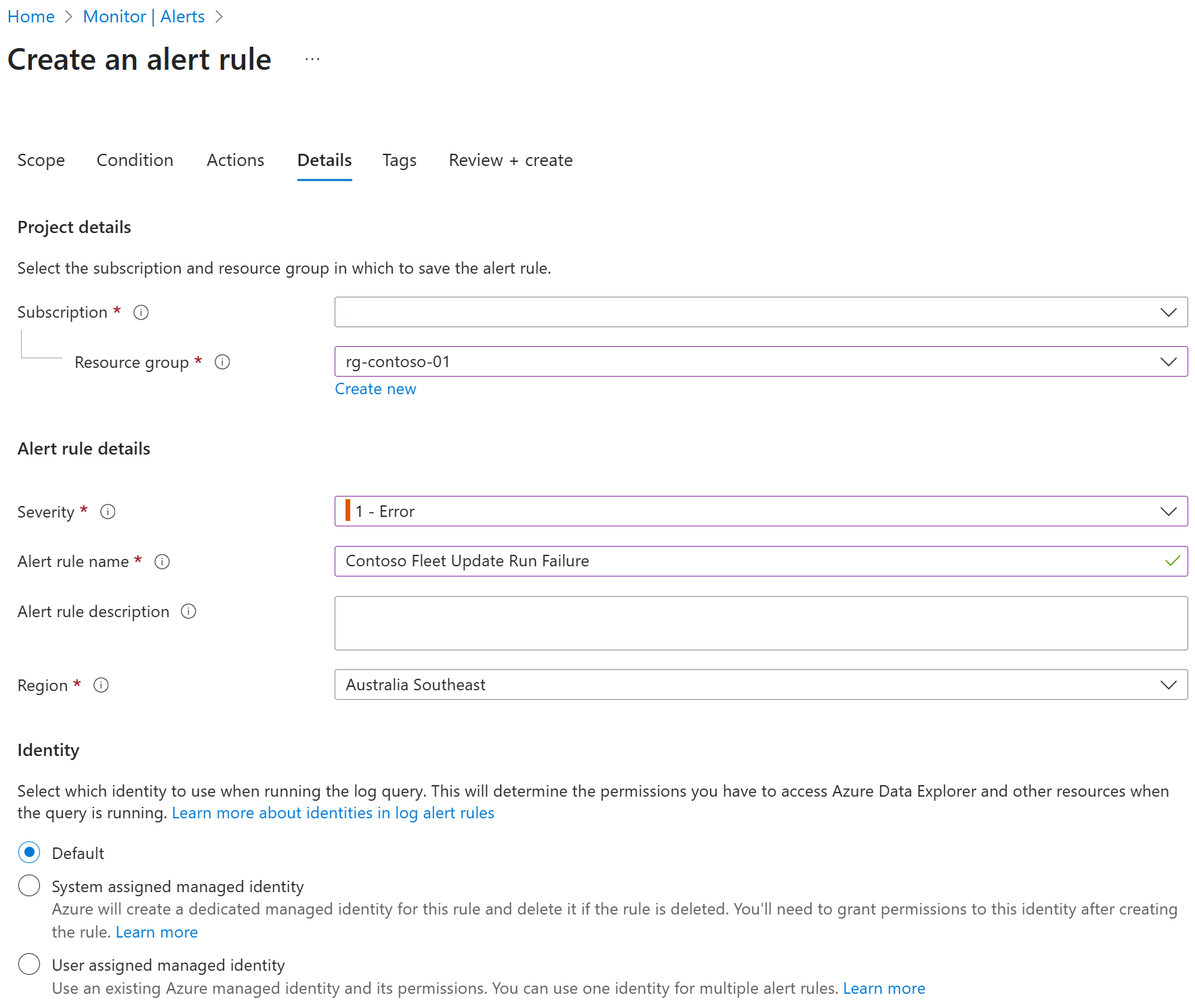Чтобы сохранить правило генерации оповещений, перейдите на вкладку "Сведения " и выберите соответствующую группу ресурсов и подписки Azure. Задайте сведения для правила генерации оповещений, выбрав серьезность, указав имя правила генерации оповещений, необязательное описание, а затем выберите регион Azure , чтобы сохранить оповещение. Наконец, задайте идентификатор, который вы хотите использовать для выполнения запроса журнала.