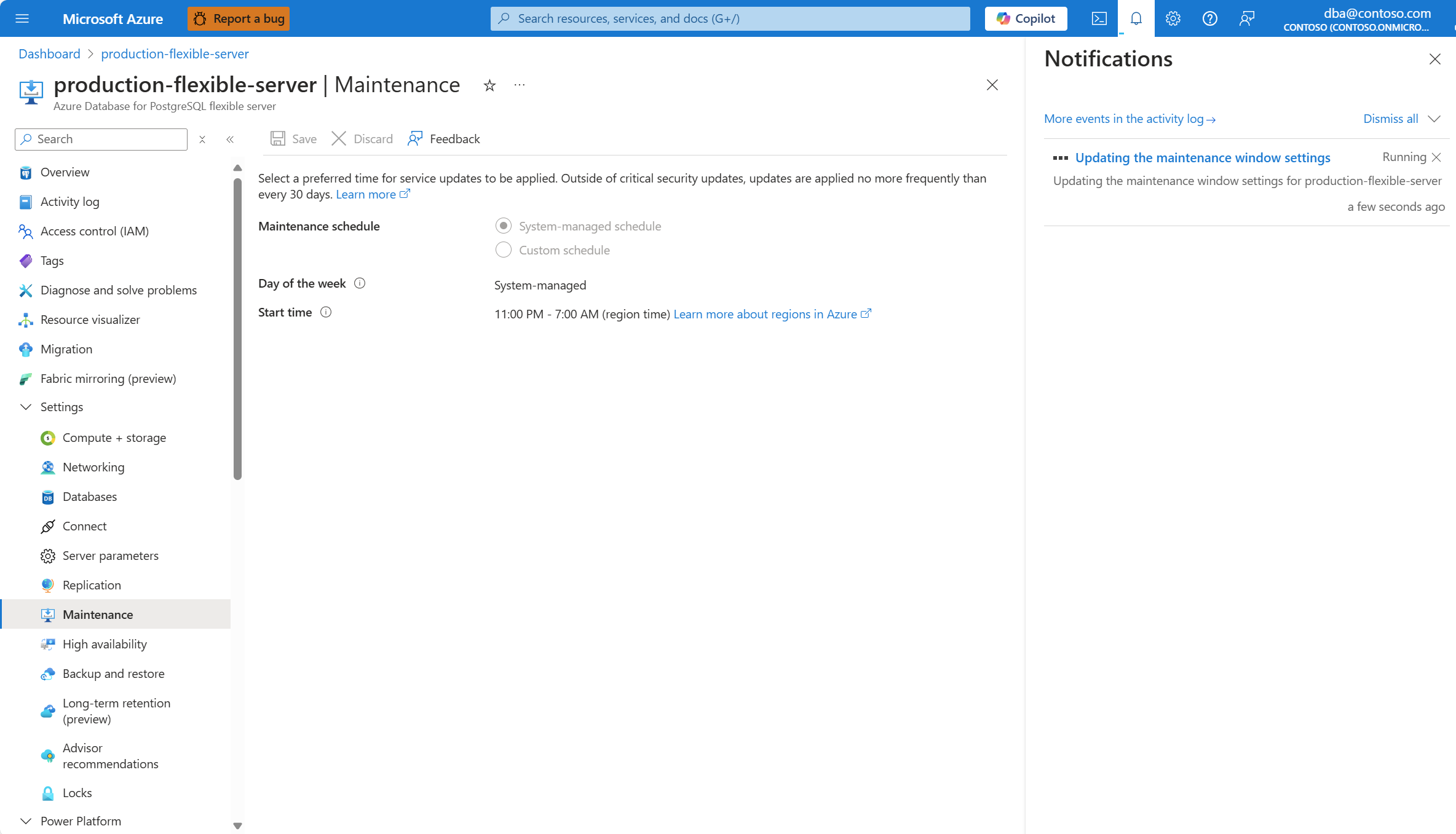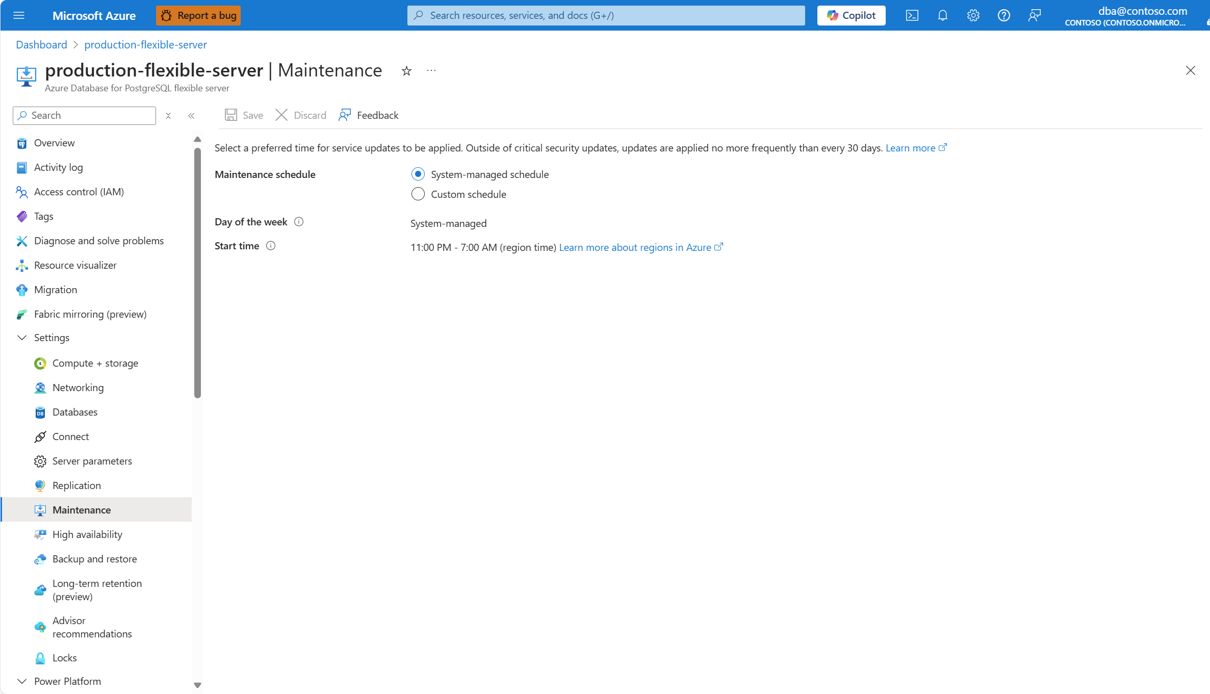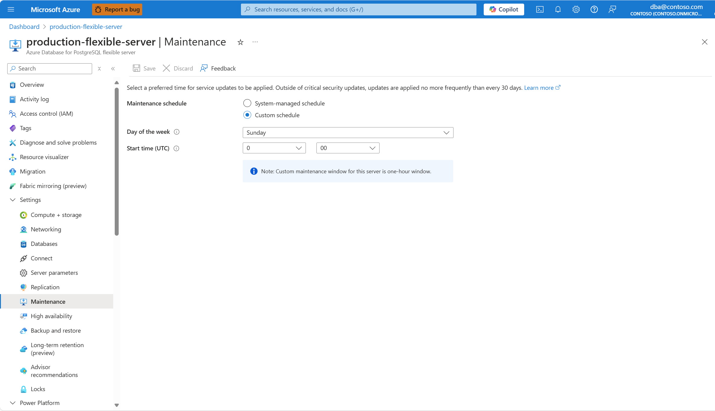 Вы можете указать параметры запланированного обслуживания для каждого гибкого экземпляра сервера Базы данных Azure для PostgreSQL в подписке Azure. Параметры включают тип запланированных мероприятий по обслуживанию и настройки уведомлений для предстоящих и завершенных мероприятий обслуживания.