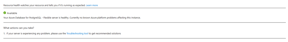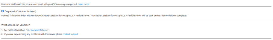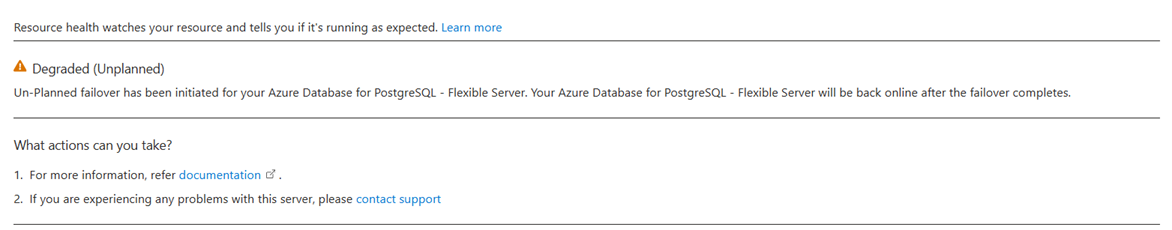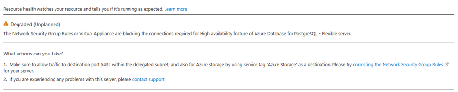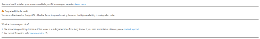 Вы можете настроить Работоспособность ресурсов оповещения для получения уведомлений в режиме реального времени при изменении состояния работоспособности экземпляра PostgreSQL с поддержкой высокой доступности. Конфигурации доступны через портал Azure или с помощью шаблона ARM, помогая получать сведения об обновлениях состояния высокого уровня доступности без активного мониторинга портала.