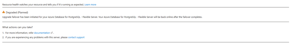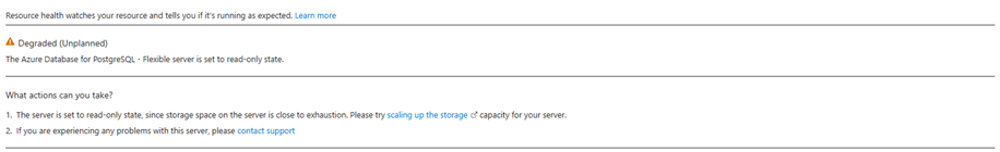 Если гибкий сервер PostgreSQL входит в состояние только для чтения, состояние "Понижение " отражает это ограничение. Обычно для этого требуется подготовка дополнительных ресурсов или устранение условий, которые привели к настройке только для чтения для восстановления полной функциональности.
