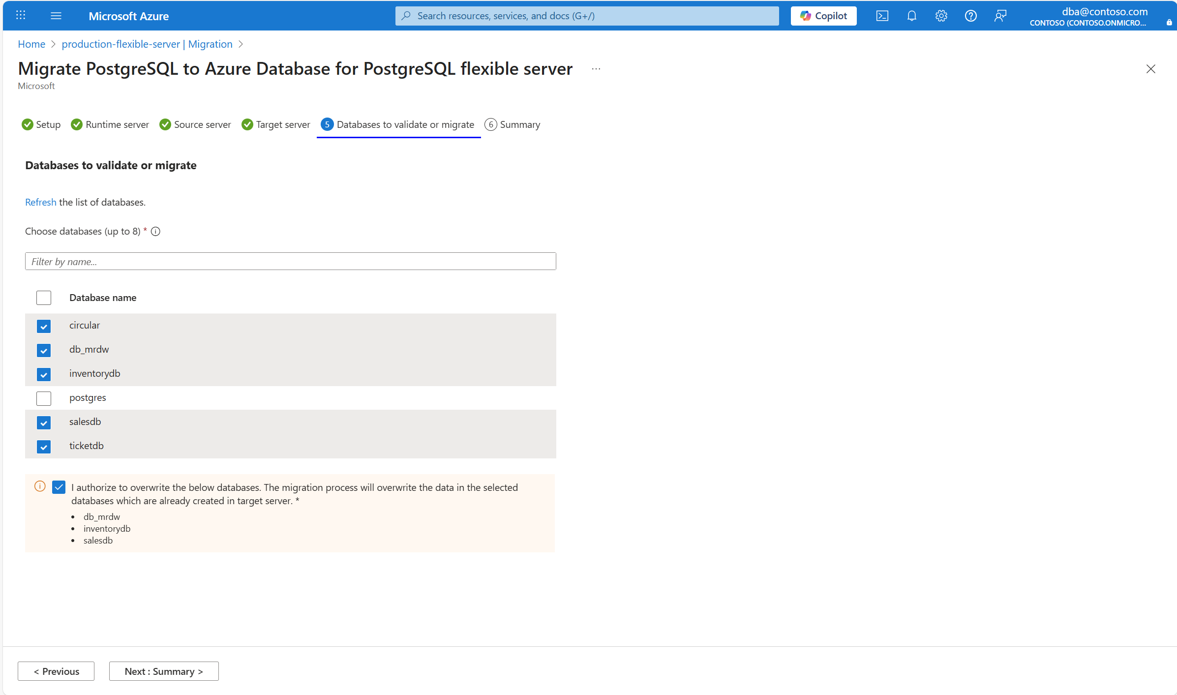 При миграции в Базу данных Azure для PostgreSQL важно решить проблему миграции пользователей и ролей отдельно, так как им требуется вмешательство вручную: