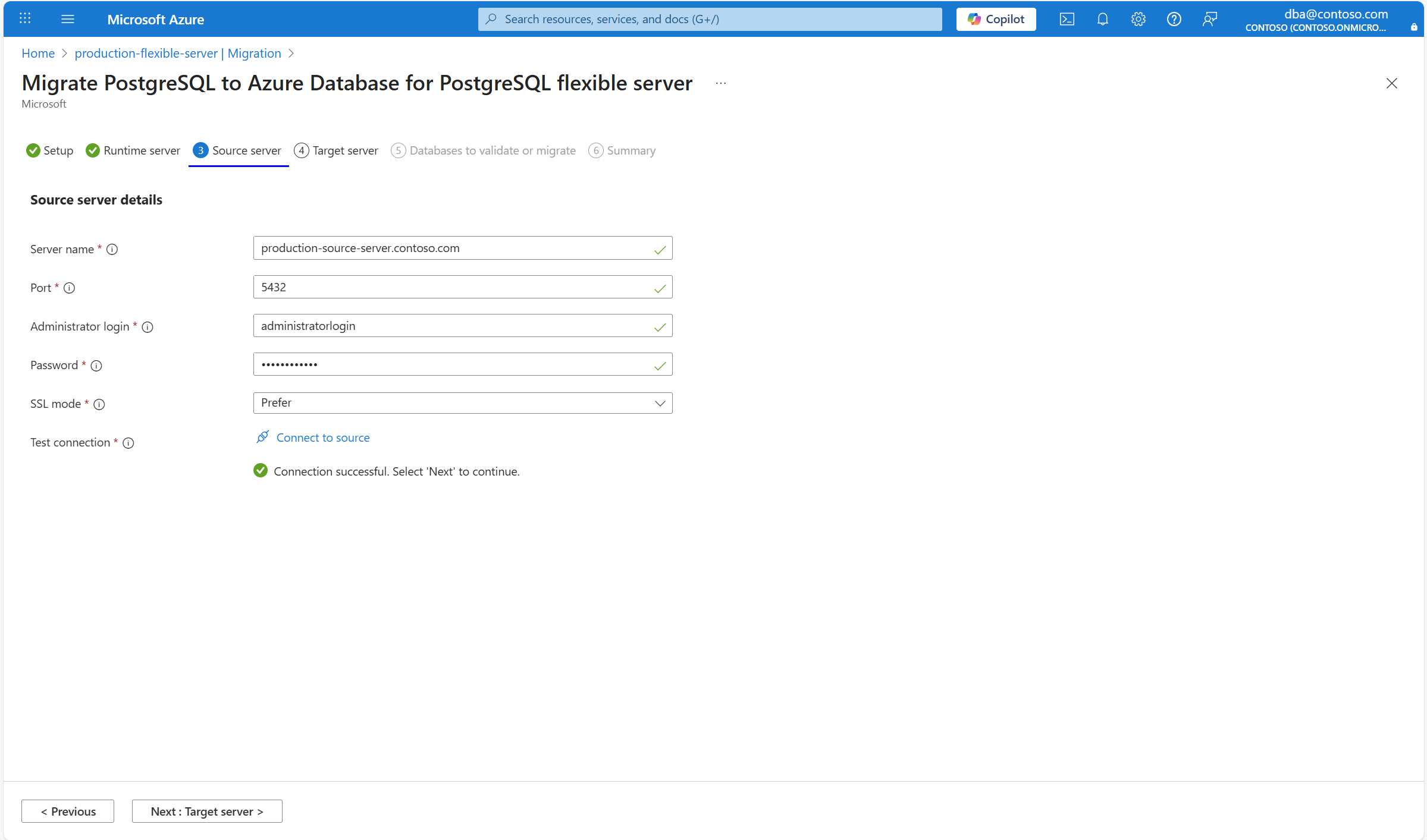 production-flexible-server.example.com,198.1.0.2или полное доменное имя PostgreSQL, напримерproduction-flexible-server.postgres.database.azure.com, если пользовательский DNS-сервер содержит DNS-зонуpostgres.database.azure.comили перенаправляет запросы для этой зоны на168.63.129.16, где полное доменное имя разрешается в общедоступной или частной зоне DNS Azure. - Проверка подключения — выполняет проверку подключения между источником и целевым объектом. После успешного подключения перейдите на следующую вкладку. Эти тесты предназначены для выявления проблем с подключением, которые могут существовать между исходными и целевыми серверами, включая проверку подлинности с использованием предоставленных учетных данных. Установка тестового подключения занимает несколько секунд.