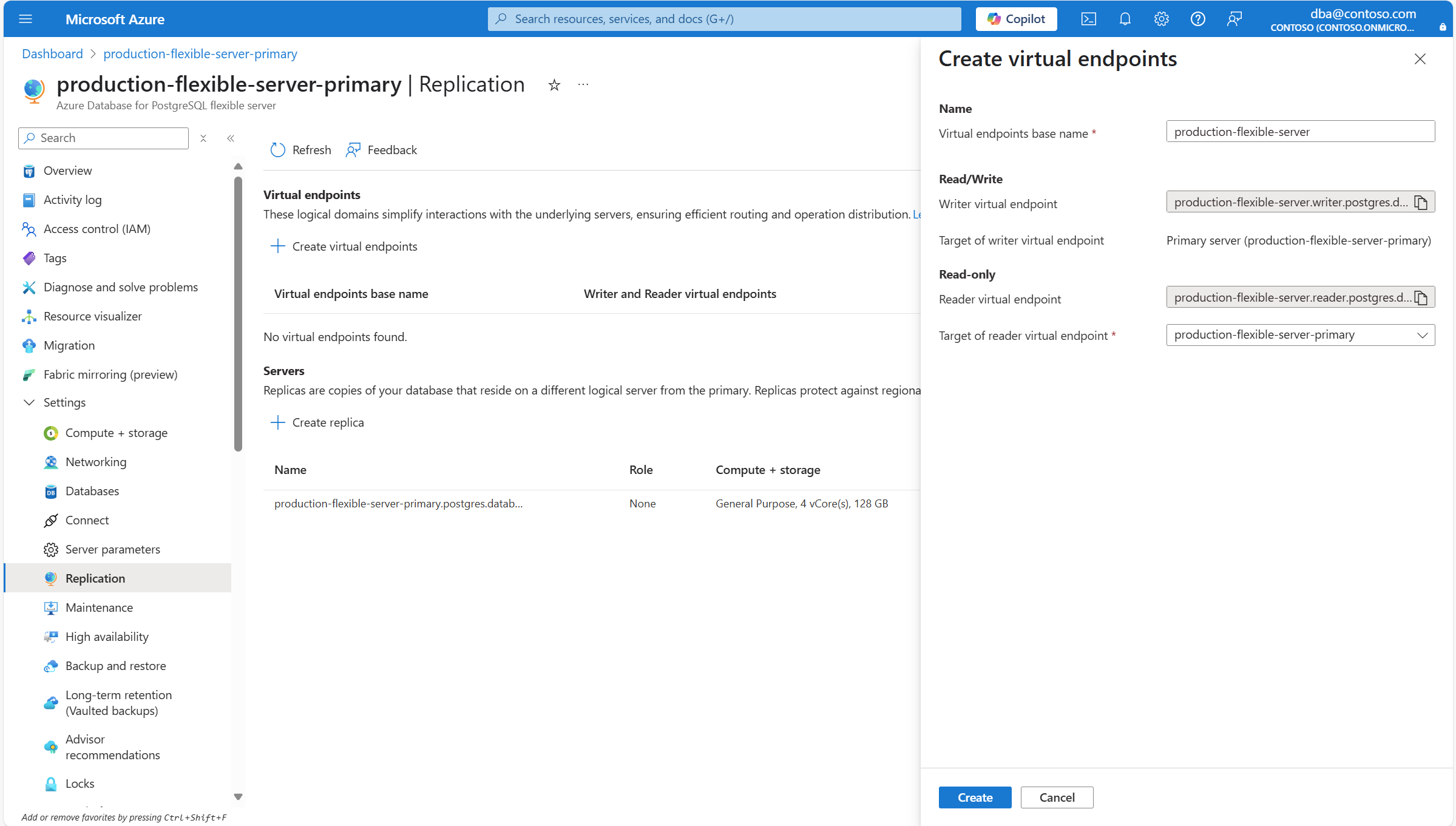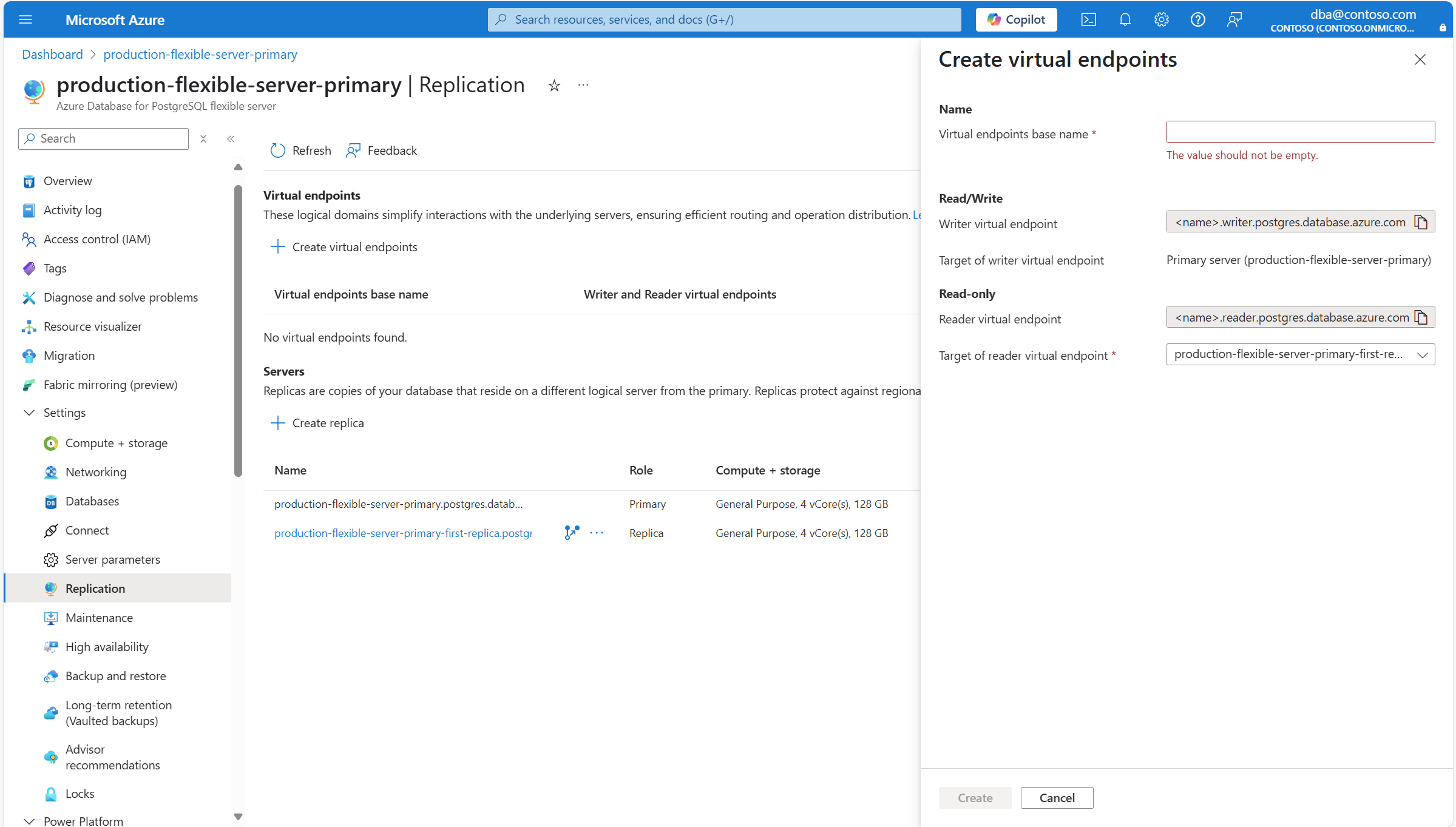 <virtual-endpoints-base-name>.writer.postgres.database.azure.comи<virtual-endpoints-base-name>.reader.postgres.database.azure.com. В диалоговом окне "Создание виртуальных конечных точек " в базовом имени виртуальных конечных точек введите понятное имя, которое еще не принимается другим сервером.Цель виртуальной конечной точки записи должна всегда указывать на основной сервер, так как это единственный сервер, настроенный для поддержки операций записи, инициированных пользователем. Если на сервере, на котором вы создаете виртуальные конечные точки, нет реплики чтения, целевая виртуальная конечная точка чтения также указывает на первичный сервер. Однако если сервер, на котором вы создаете виртуальные конечные точки, имеет реплику чтения, то по умолчанию цель виртуальной конечной точки чтения указывает на одну из реплик чтения и может быть изменена на основной сервер или любую другую реплику чтения, если таких реплик больше одной.