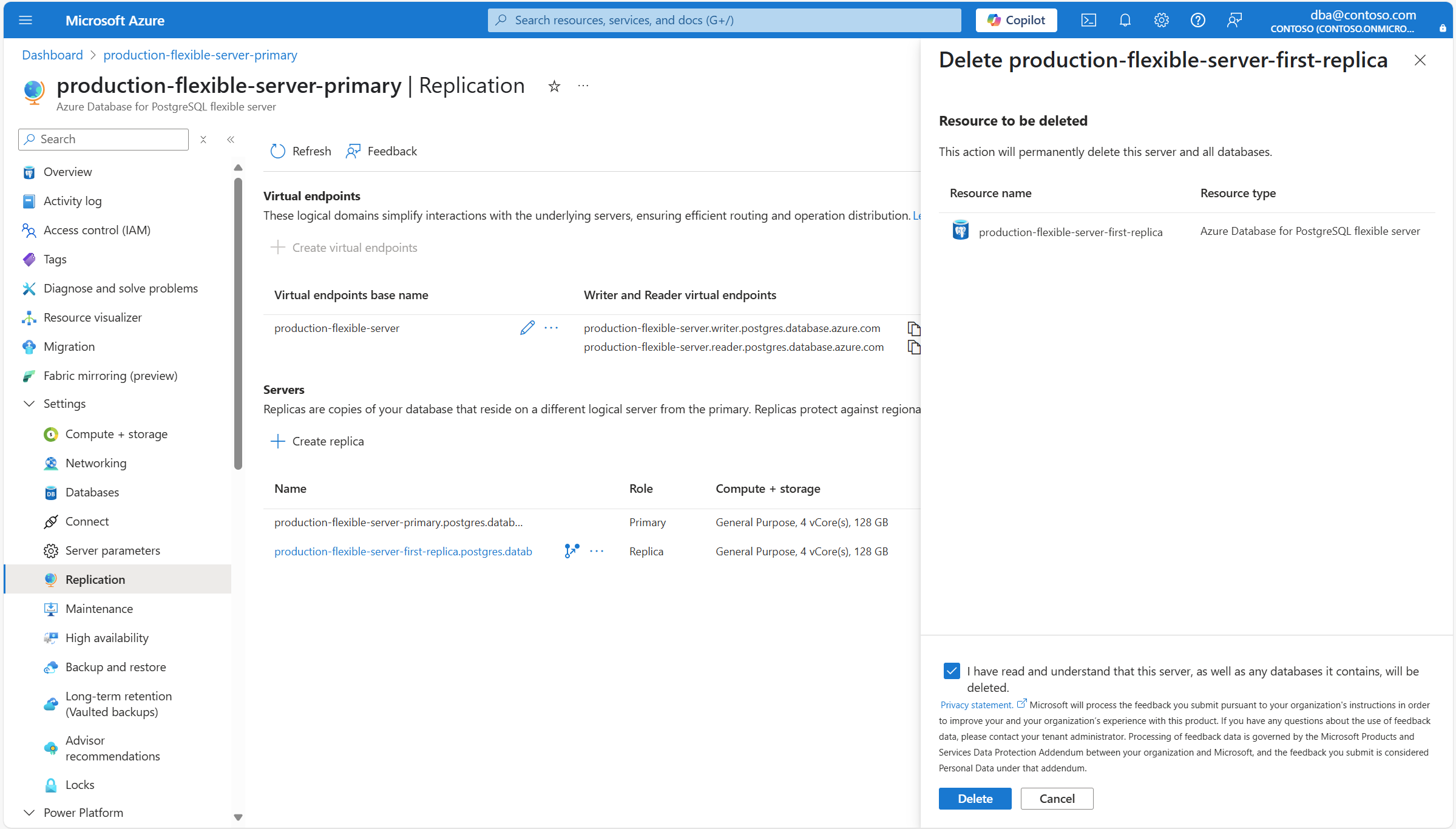 В этой статье приведены пошаговые инструкции по удалению реплики чтения гибкого экземпляра сервера Базы данных Azure для PostgreSQL.
