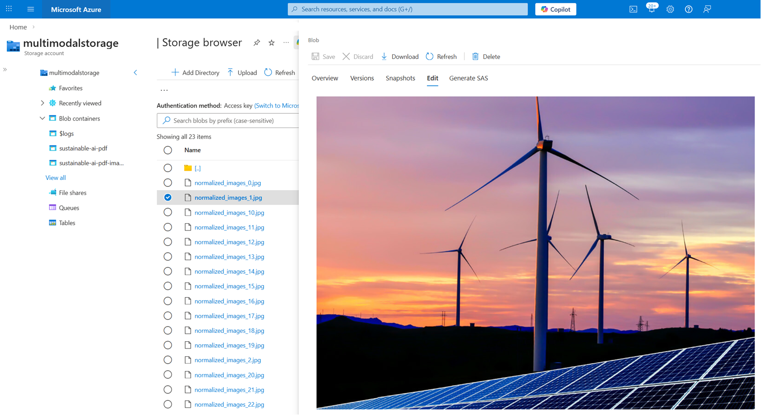 Помните, что набор навыков в этом руководстве создает хранилище знаний для содержимого изображения, извлеченного из PDF- файла. После запуска индексатора контейнер sustainable-ai-pdf-images должен содержать примерно 23 изображения.