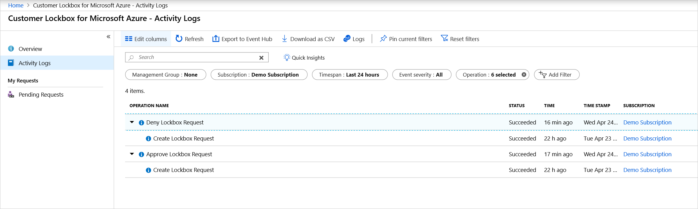 В портале Azure, на странице Customer Lockbox для Microsoft Azure, выберите журналы действий, чтобы просмотреть сведения об аудите, связанные с запросами Customer Lockbox. Вы также можете просмотреть журналы активности в панели сведений о соответствующей подписке. В обоих случаях можно отфильтровать определенные операции, например:
