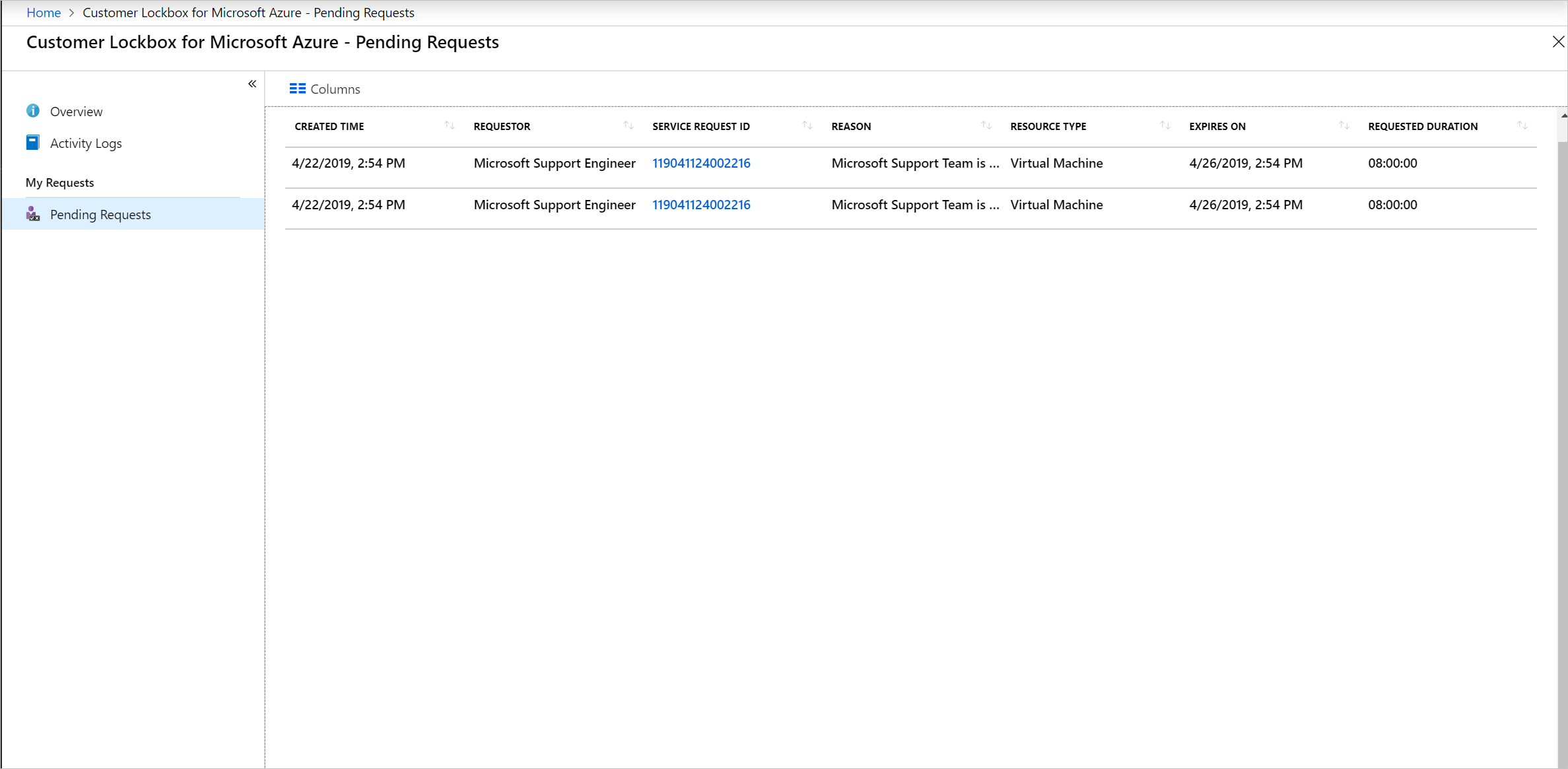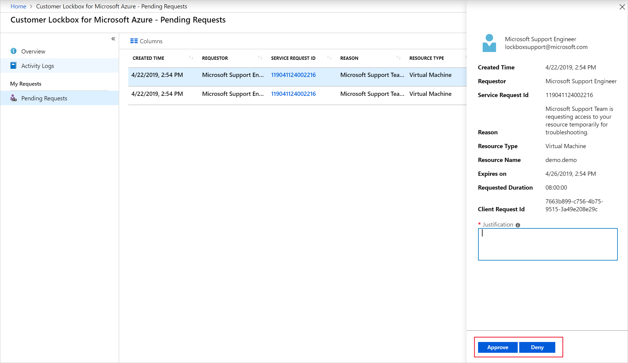 Запрос остается в очереди клиента в течение четырех дней. По истечении этого времени срок действия запроса на доступ истекает автоматически, и доступ к инженерам Майкрософт не предоставляется.Чтобы получить сведения об ожидающем запросе, уполномоченный утверждающий может выбрать Customer Lockbox-запрос из Ожидающих Запросов: