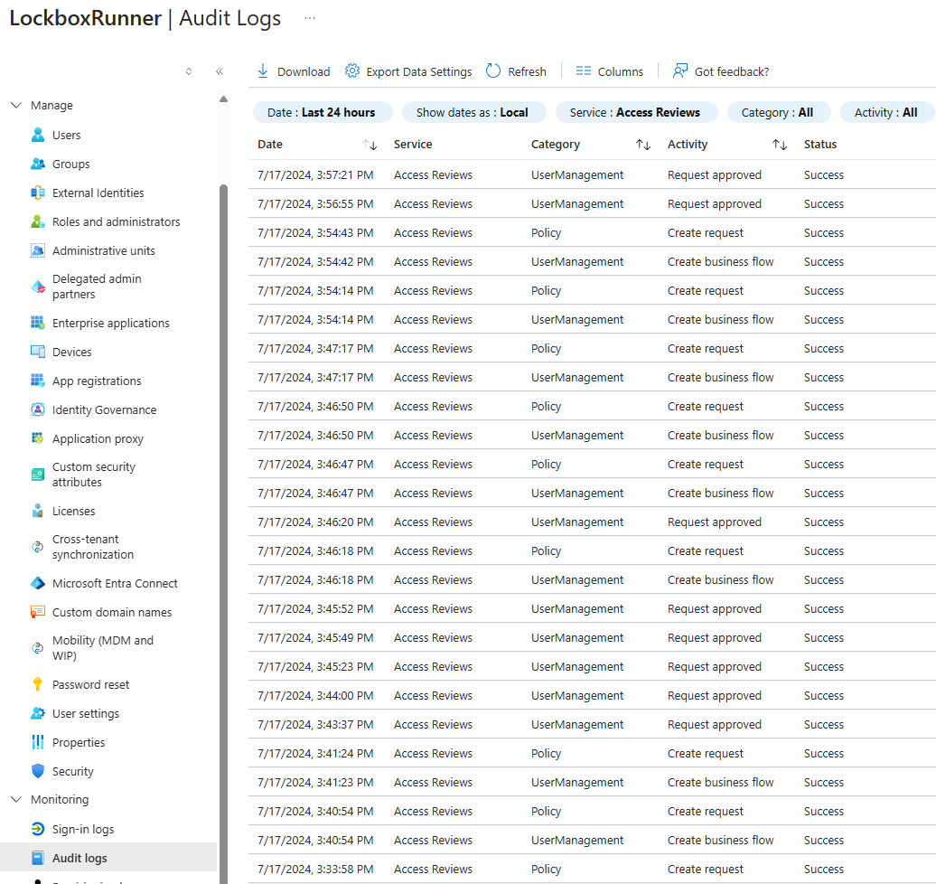 Вы можете отфильтровать для Service = Access Reviews и Activity = one of the above activities.