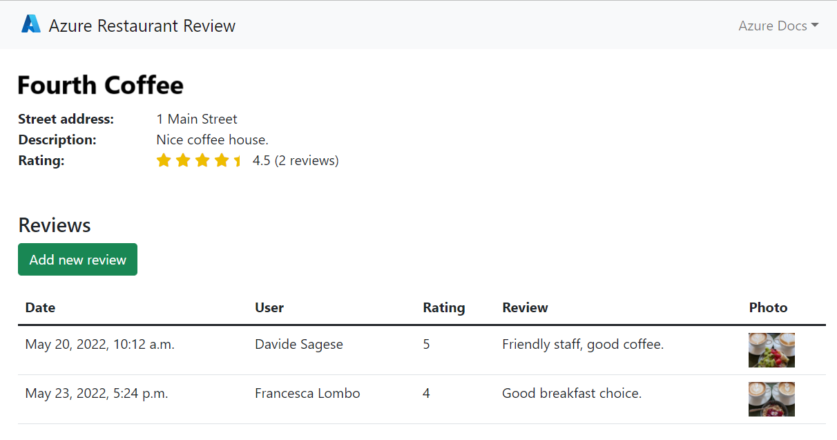 Проверьте функциональные возможности примера приложения, добавив ресторан и некоторые отзывы с фотографиями для ресторана. Сведения о ресторане и обзоре хранятся в базе данных Azure для PostgreSQL, а фотографии хранятся в службе хранилища Azure. Ниже приведен пример снимка экрана: