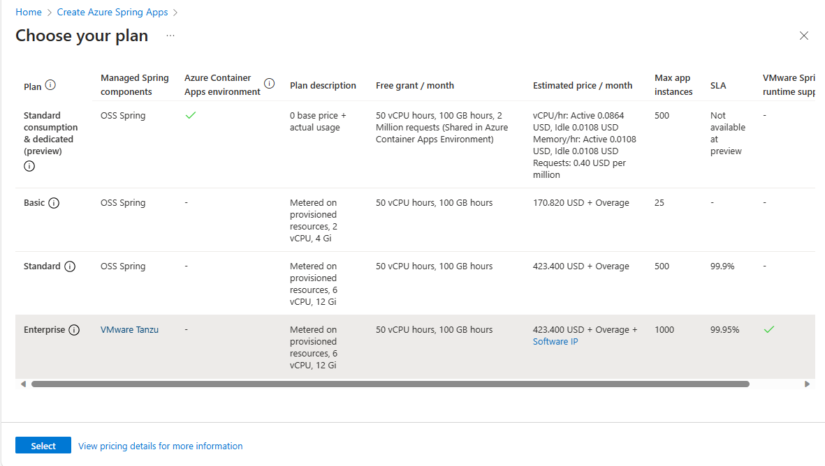 В плане Azure Spring Apps Enterprise компоненты VMware Tanzu заменяют компоненты OSS Spring Cloud, чтобы обеспечить дополнительную поддержку функций. Компоненты Tanzu включаются по запросу в соответствии с вашими потребностями. Перед созданием экземпляра службы Azure Spring Apps необходимо включить необходимые компоненты.