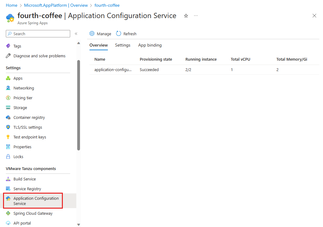 В экземпляре Azure Spring Apps Enterprise выберите в области навигации службу конфигурации приложений. Просмотрите текущее состояние и выделенные ресурсы для Службы конфигурации приложений для Tanzu.