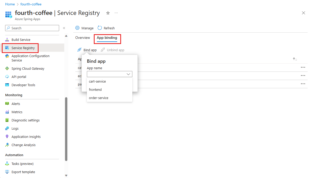 В экземпляре Azure Spring Apps Enterprise выберите реестр служб.