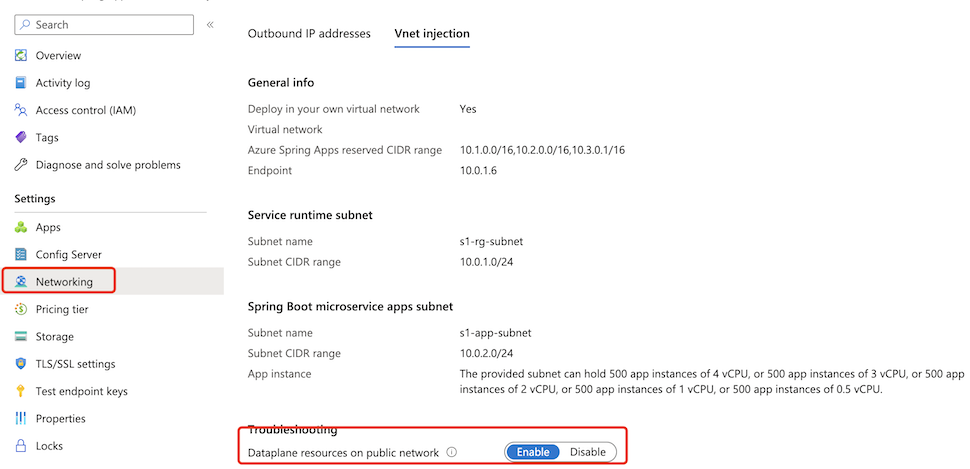 Выберите экземпляр службы Azure Spring Apps, развернутый в виртуальной сети, а затем выберите "Сеть " в меню навигации.