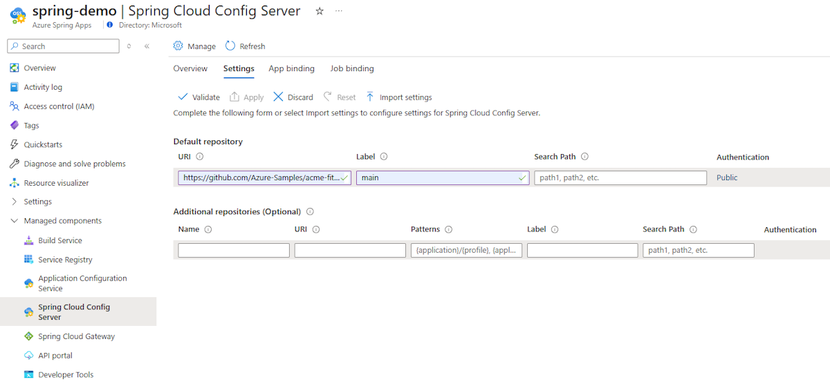 Если в ACS есть только один репозиторий, сопоставьте его с репозиторием по умолчанию для Сервера конфигурации Spring Cloud без имен и шаблонов. Если у вас несколько репозиториев в ACS, выберите один репозиторий в качестве репозитория по умолчанию для Сервера конфигурации Spring Cloud и используйте другие в качестве дополнительных репозиториев. Перенос свойств, включая