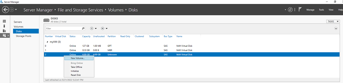 На виртуальной машине Windows Server 2019 Datacenter выберите Файловые службы и службы хранилища>Тома>Диски.
