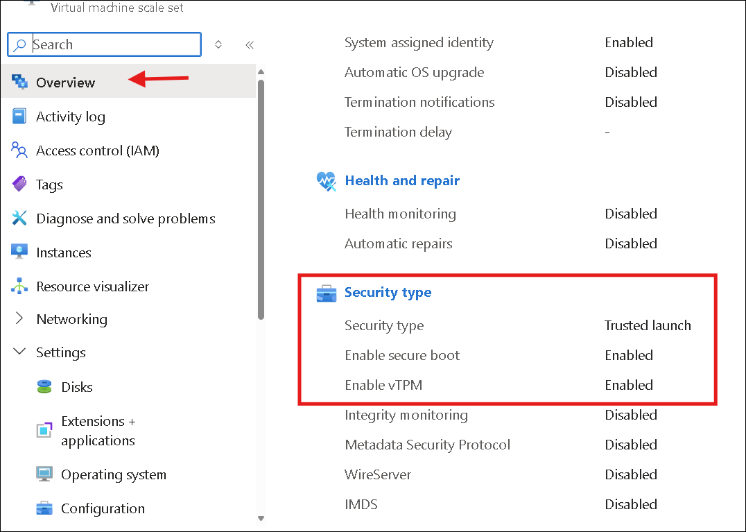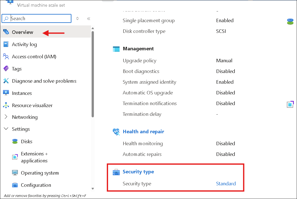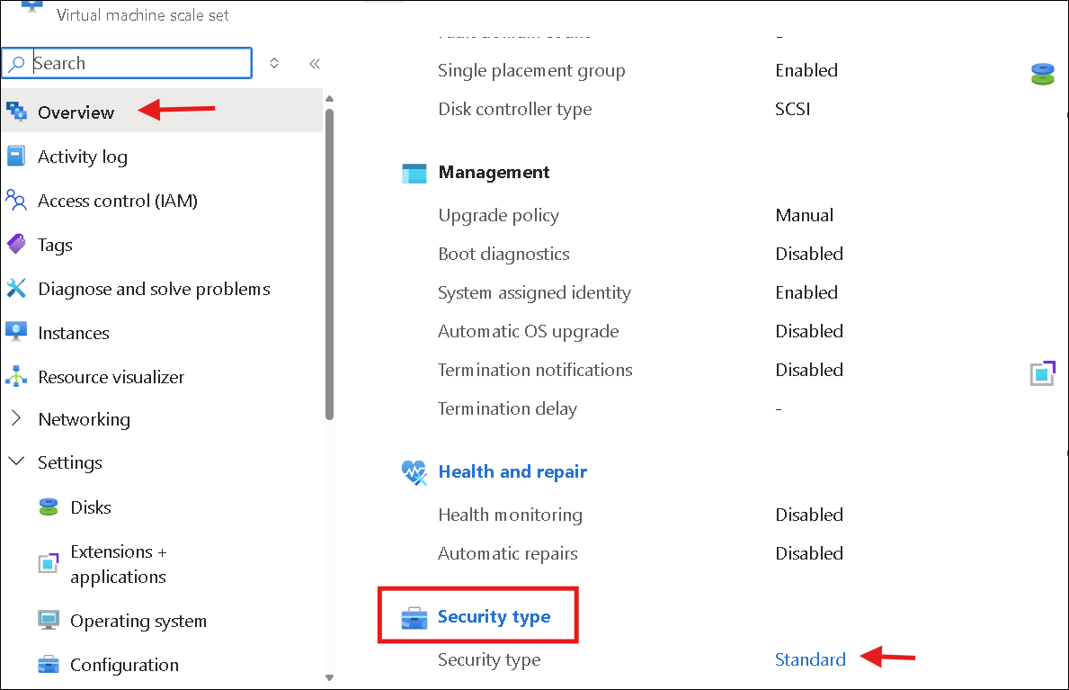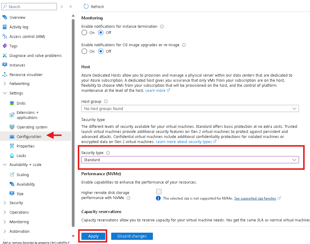 Configurationв разделеSettings->. На страницеConfiguration, обновите раскрывающееся меню сTrusted launchнаStandard, чтобы отключить конфигурацию безопасности доверенного запуска. ЩелкнитеYes, чтобы подтвердить изменения.