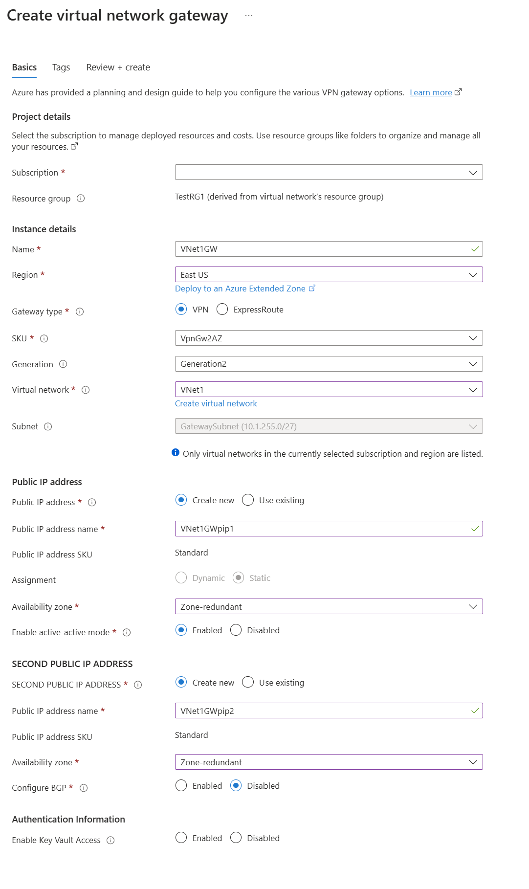 — Некоторые VPN-устройства не поддерживают активный и активный режим. Если вы не уверены, обратитесь к поставщику VPN-устройств. Если вы используете VPN-устройство, которое не поддерживает активный режим, можно выбрать "Отключено " для этого параметра.Второе имя общедоступного IP-адреса Доступно только для шлюзов активно-активного режима. Пример: VNet1GWpip2 Зона доступности Пример: зонально-избыточный. Настройка BGP. Выберите "Отключено", если для настройки не требуется этот параметр. Если этот параметр требуется, значение ASN по умолчанию равно 65515. Включение доступа к Key Vault Выберите "Отключено" , если у вас нет определенного требования, чтобы включить этот параметр. Выберите Просмотр и создание, чтобы выполнить проверку.