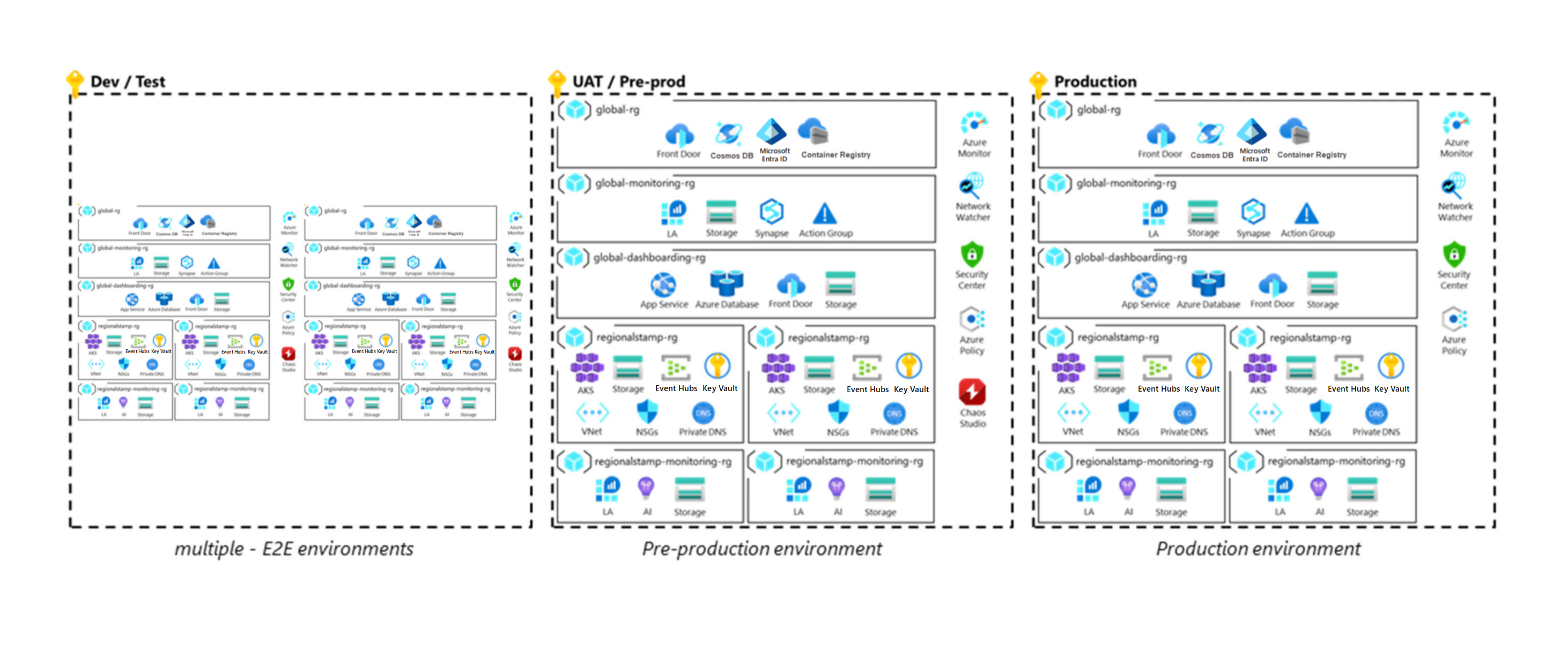 Для проверки и выполнения операций развертывания требуется различные типы сред. Типы имеют различные возможности и жизненные циклы. Некоторые среды могут отражать производственную среду и иметь длительное время существования, а другие могут быть недолговечными и обладать меньшими возможностями, чем у производственной. Настройка этих сред в начале цикла разработки помогает обеспечить гибкость, разделение производственных и предварительных ресурсов и тщательное тестирование операций перед выпуском в рабочей среде. Все среды должны отражать рабочую среду как можно больше, хотя при необходимости можно применить упрощение к более низким средам. На этой схеме показана критически важная архитектура: