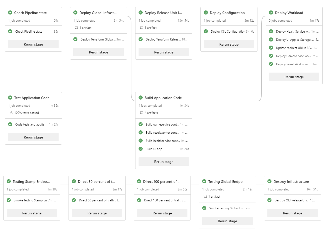 Примените подход развертывания blue/green, чтобы выпустить все изменения в рабочей среде. Развертывайте всю инфраструктуру и приложение каждый раз для любого типа изменений, чтобы обеспечить согласованное состояние и нулевое время простоя. Хотя вы можете повторно использовать среды, мы не рекомендуем использовать его для критически важных рабочих нагрузок. Рассматривайте каждую метку регионального развертывания как временную, с жизненным циклом, связанным с одним выпуском.