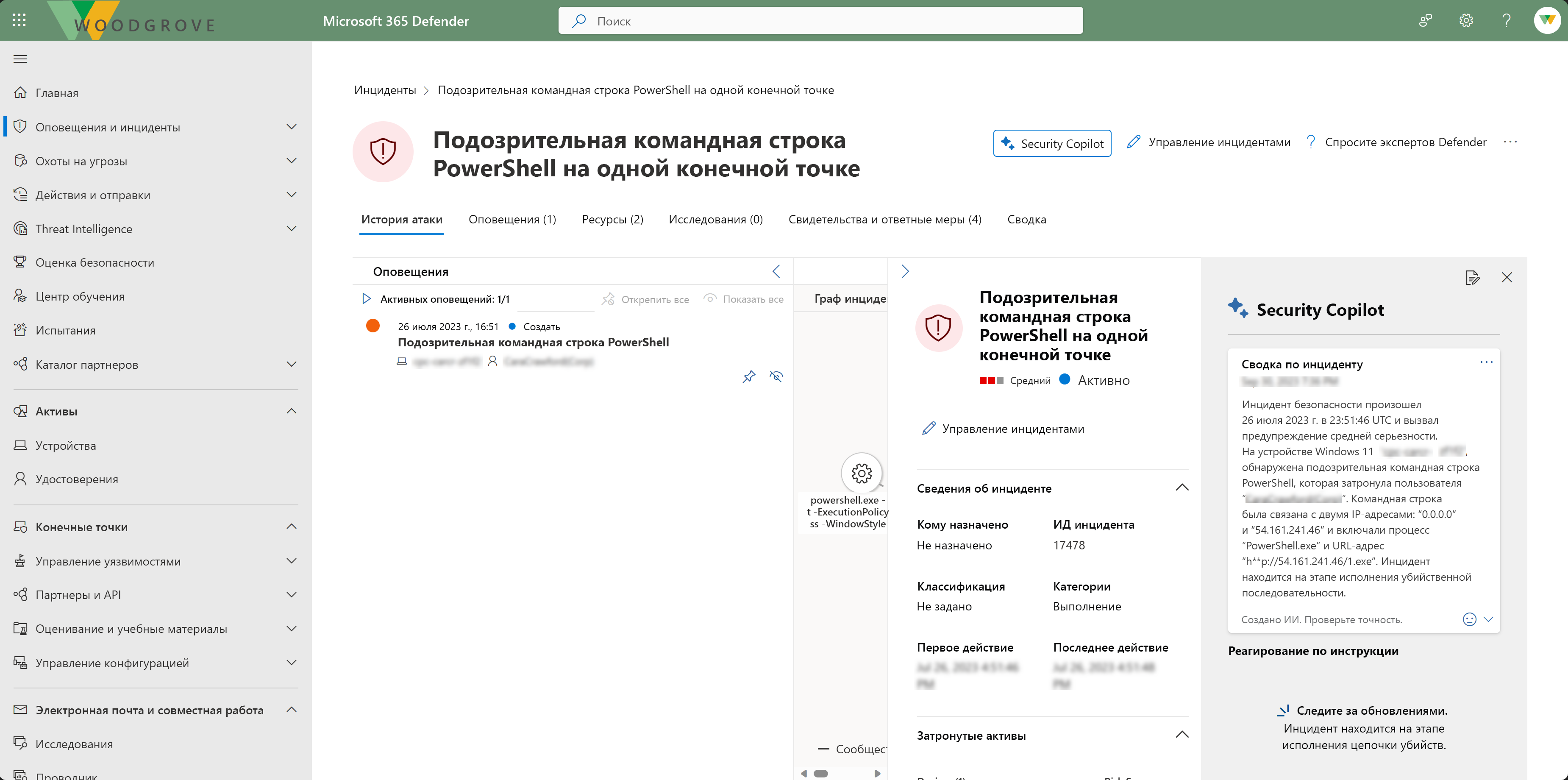 Security Copilot интегрирована в Microsoft Defender XDR. На странице инцидента нажмите кнопку Copilot , чтобы получить сводку по инциденту и получить такие сведения, как время и дата начала атаки, сущность или ресурс, который начал атаку, а также ресурсы, участвующие в атаке.