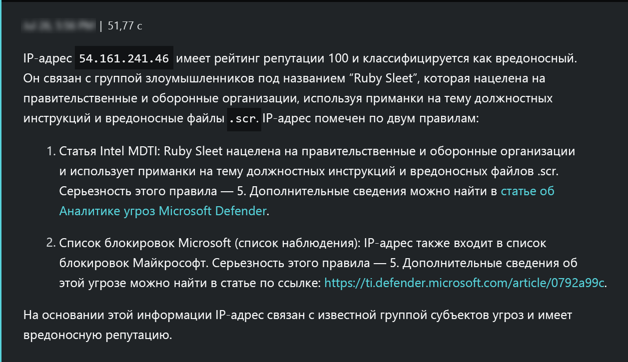 Ответ указывает, что несколько индикаторов в скрипте связаны с известными субъектами угроз. Вы можете закрепить этот ответ с важной информацией, чтобы использовать ее в дальнейшем.