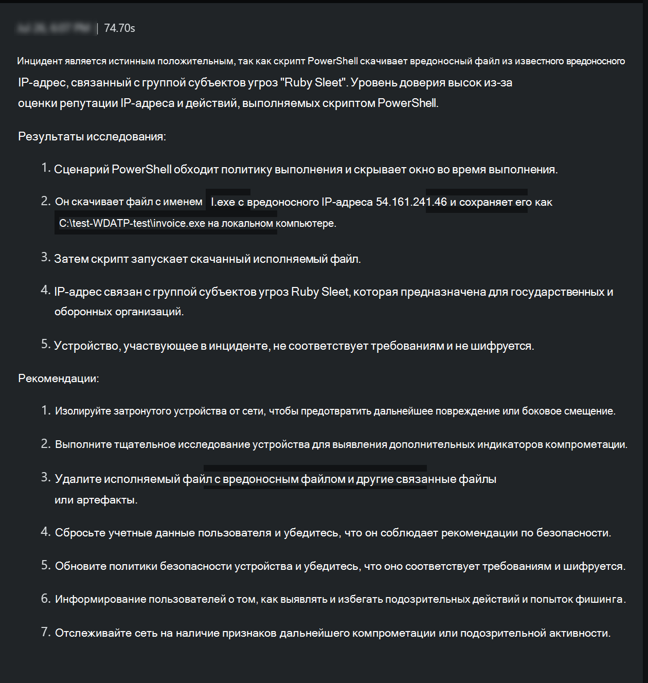 Кроме того, Security Copilot создали оценку с помощью сводного отчета и предоставили набор рекомендаций по сдерживанию инцидента, которые также можно использовать для улучшения навыков.