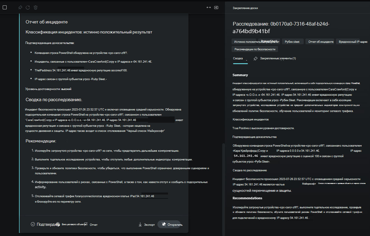 Полученный ответ можно экспортировать для дальнейшего использования. Вы также можете предоставить доступ ко всему сеансу другим аналитикам. Другие участники команды, которые рассматривают инцидент, могут использовать пин-доску, чтобы получить полную сводку по шагам расследования, что экономит им ценное время.