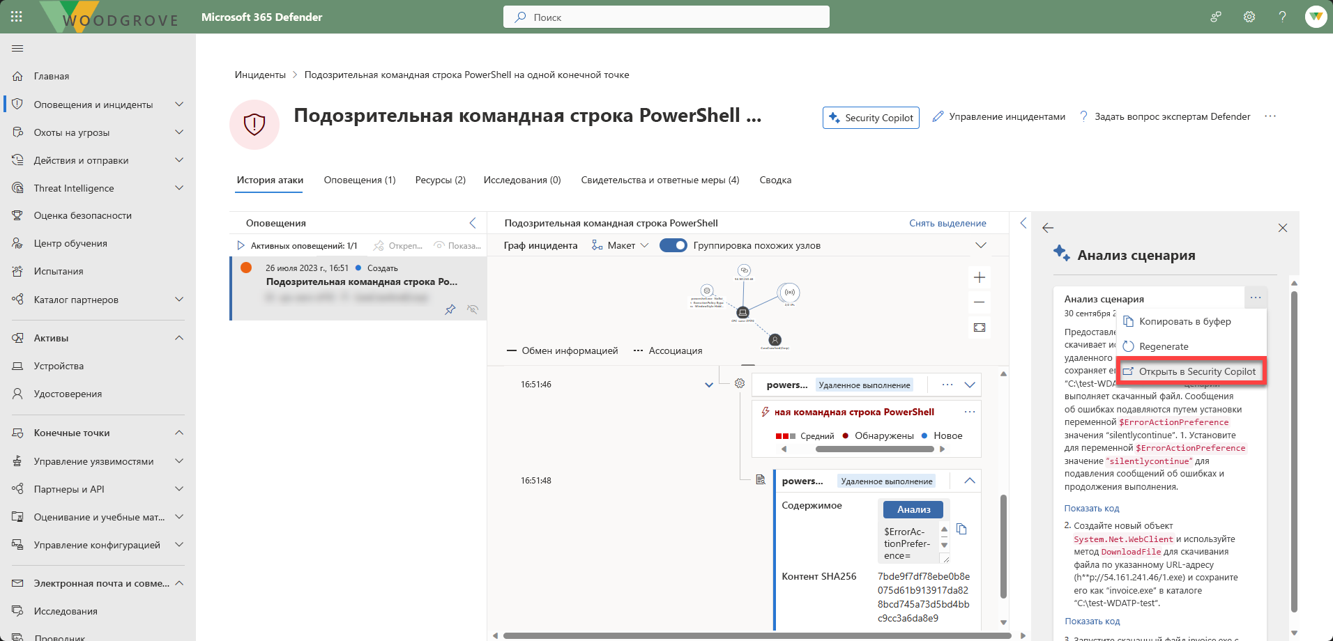 Microsoft Defender XDR флаги при выполнении подозрительного скрипта. Используйте Security Copilot, чтобы объяснить, что делает подозрительный скрипт.