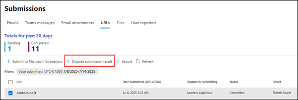 Отправьте ложноотрицательный (плохой) URL-адрес в корпорацию Майкрософт для анализа на странице Отправки на портале Defender.