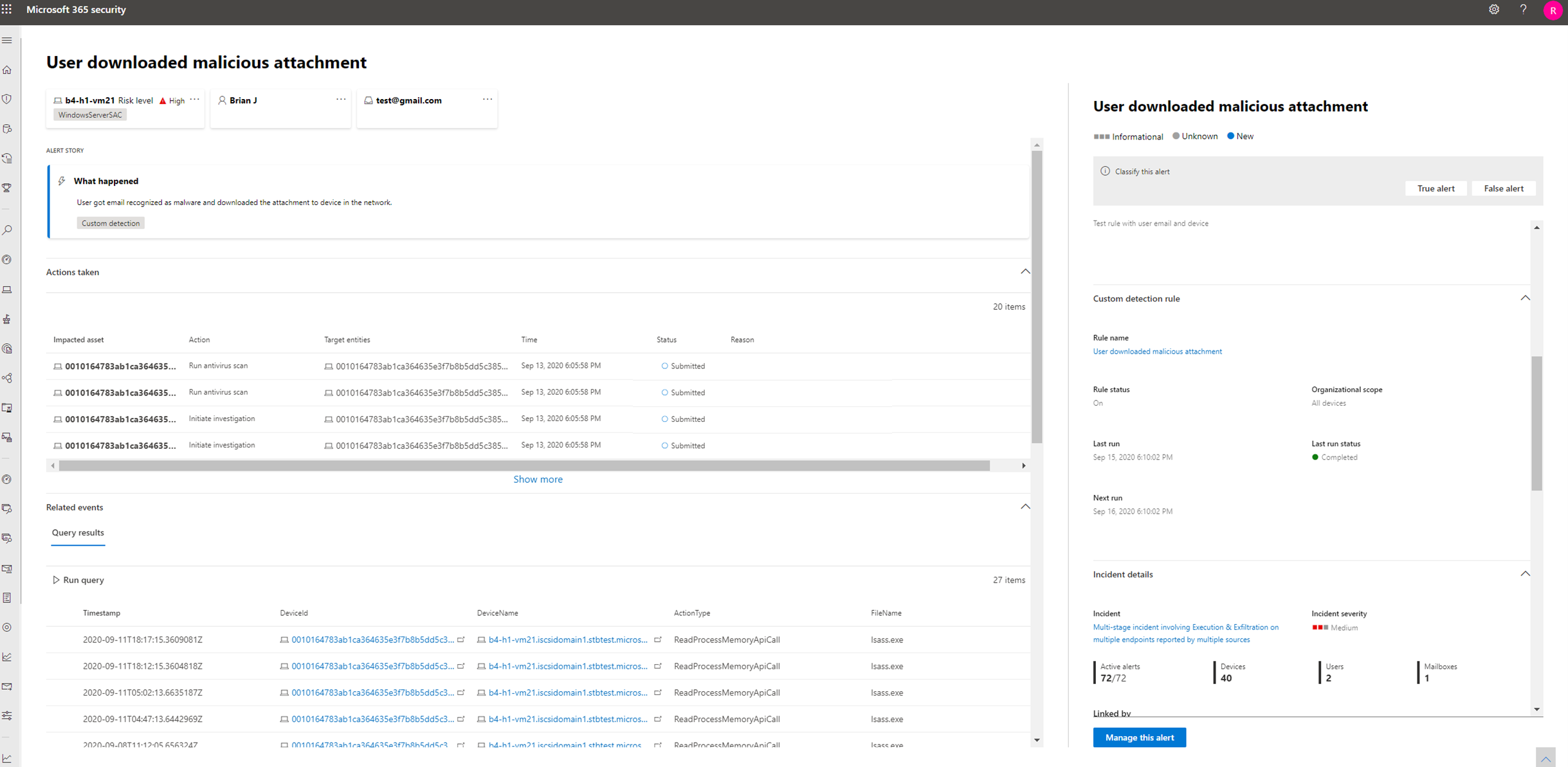 - Не подавляется правилами подавления Microsoft Defender для конечной точки. Чтобы предотвратить создание оповещений для определенных пользователей, устройств или почтовых ящиков, измените соответствующие запросы, чтобы исключить эти сущности явным образом.
