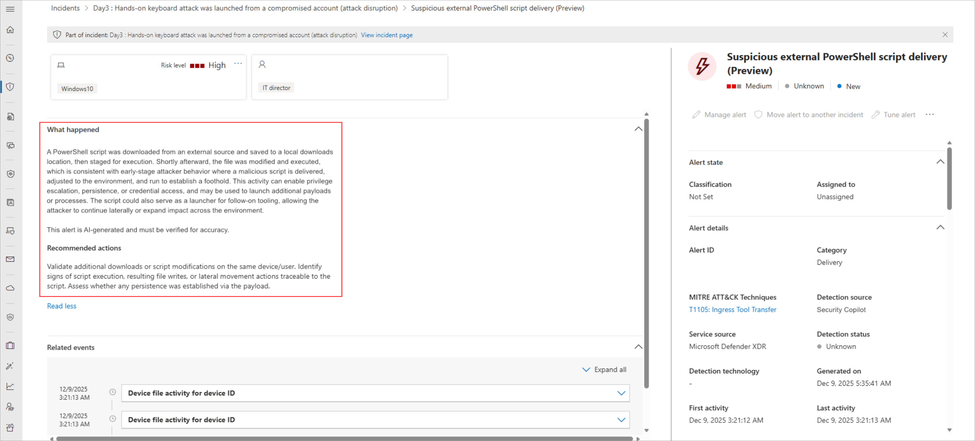 Чтобы просмотреть дополнительные сведения об оповещении, выберите заголовок оповещения. Агент динамического обнаружения угроз предоставляет сводку и рекомендуемые действия на странице оповещений.