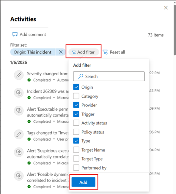 Действия в журнале действий можно отфильтровать по источнику, категории, поставщику, триггеру, состоянию действия, состоянию политики, типу, имени целевого объекта, типу целевого объекта или выполнено. Перейдите в раздел Добавить фильтр, выберите нужные фильтры и нажмите кнопку Добавить.