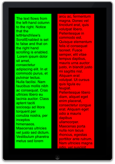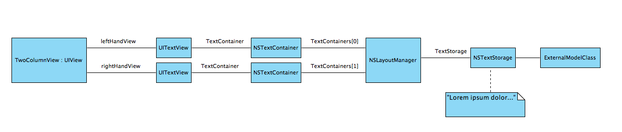 The preceding diagram illustrates the objects directly involved in the two-column layout. The NSTextStorage is the responsibility of some external model class and the two-column user-interface is specified by a custom UIView (TwoColumnView).