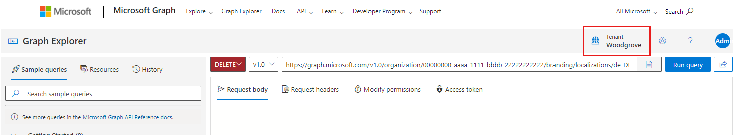 https://developer.microsoft.com/en-us/graph/graph-explorer?tenant=<your-tenant-name.onmicrosoft.com>Запросите объект фирменной символики по умолчанию с помощью API Microsoft Graph: