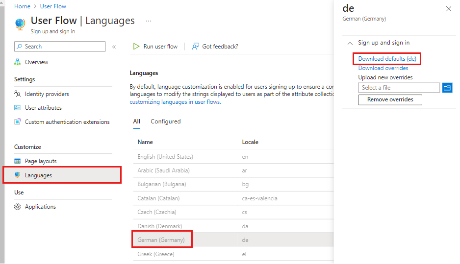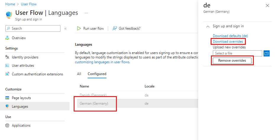 - Чтобы дважды проверить изменения, выберите язык на вкладке "Настроено " и разверните параметр регистрации и входа . Вы можете просмотреть настраиваемый языковой файл, выбрав "Скачать переопределения". Чтобы удалить настроенный файл переопределения, выберите "Удалить переопределения".