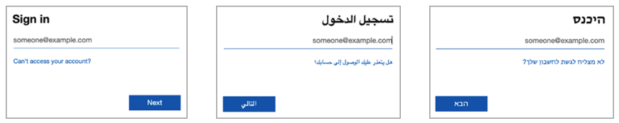 Языки, которые читаются справа налево, например арабский и иврит, отображаются в противоположном направлении по сравнению с языками, которые читаются слева направо. Внешний арендатор поддерживает функции и возможности справа-налево для языков, работающих в среде ввода и отображения данных справа-налево. Читатели, читающие справа налево, могут взаимодействовать естественным образом.