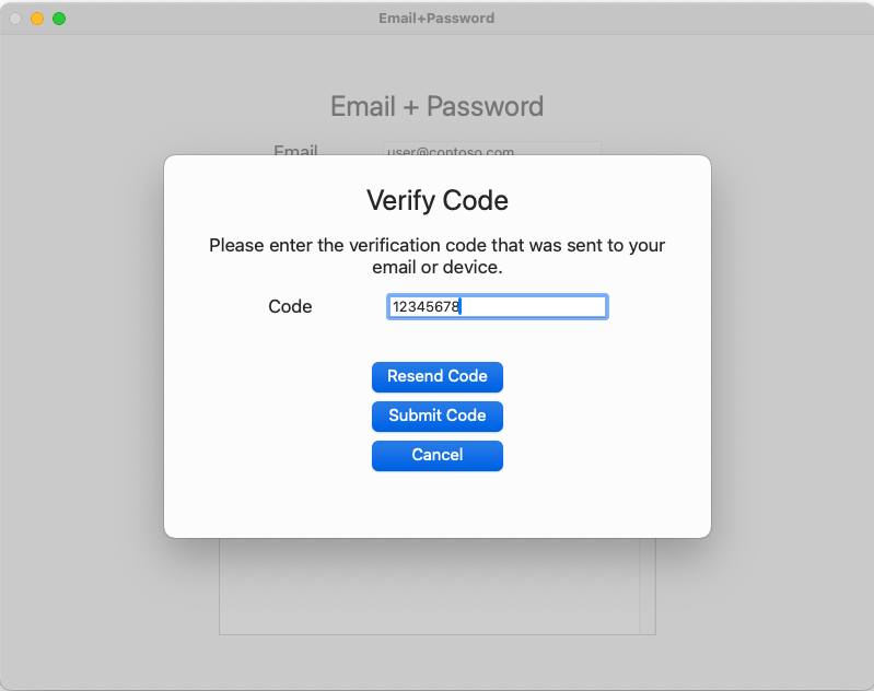 В этом руководстве проверяется использование электронной почты и пароля . Введите допустимый адрес электронной почты и пароль, выберите "Регистрация" и запустите экран кода отправки: