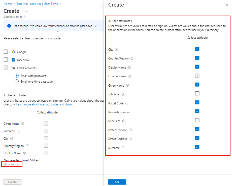В разделе "Атрибуты пользователя" выберите атрибуты, которые необходимо собрать от пользователя во время регистрации.