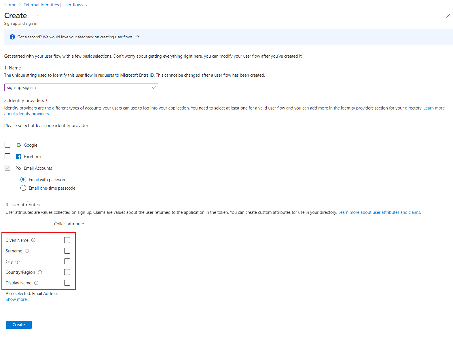 Вы можете создать простой интерфейс регистрации и входа для клиентов, добавив в приложение поток пользователя. Поток пользователей определяет ряд шагов регистрации, которые пользователи выполняют, и методы входа, которые они могут использовать (например, электронную почту и пароль, одноразовые секретные коды или учетные записи социальных сетей из Google, Facebook, Apple) или настраиваемую федерацию OIDC. Вы также можете собирать сведения от клиентов во время регистрации, выбрав из ряда встроенных пользовательских атрибутов или добавив собственные пользовательские атрибуты.
