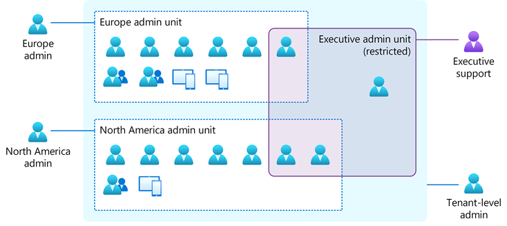 На следующей схеме показан пример административной единицы управления с ограниченным доступом (показан в пурпурном поле) с объектами, которые могут быть изменены только поддержкой руководителей. Администраторы уровня арендатора и локальные администраторы не могут изменять объекты в исполнительном административном подразделении.