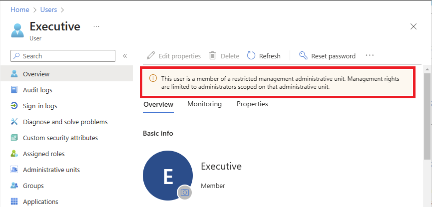 This user is a member of a restricted management administrative unit. Management rights are limited to administrators scoped on that administrative unit.
