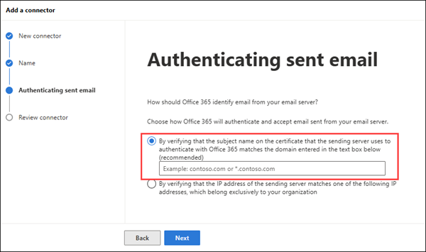 На странице Проверка подлинности отправленной электронной почтыубедитесь, что имя субъекта сертификата, используемого отправляющим сервером для проверки подлинности с помощью Office 365, соответствует домену, указанному в текстовом поле ниже (рекомендуется).