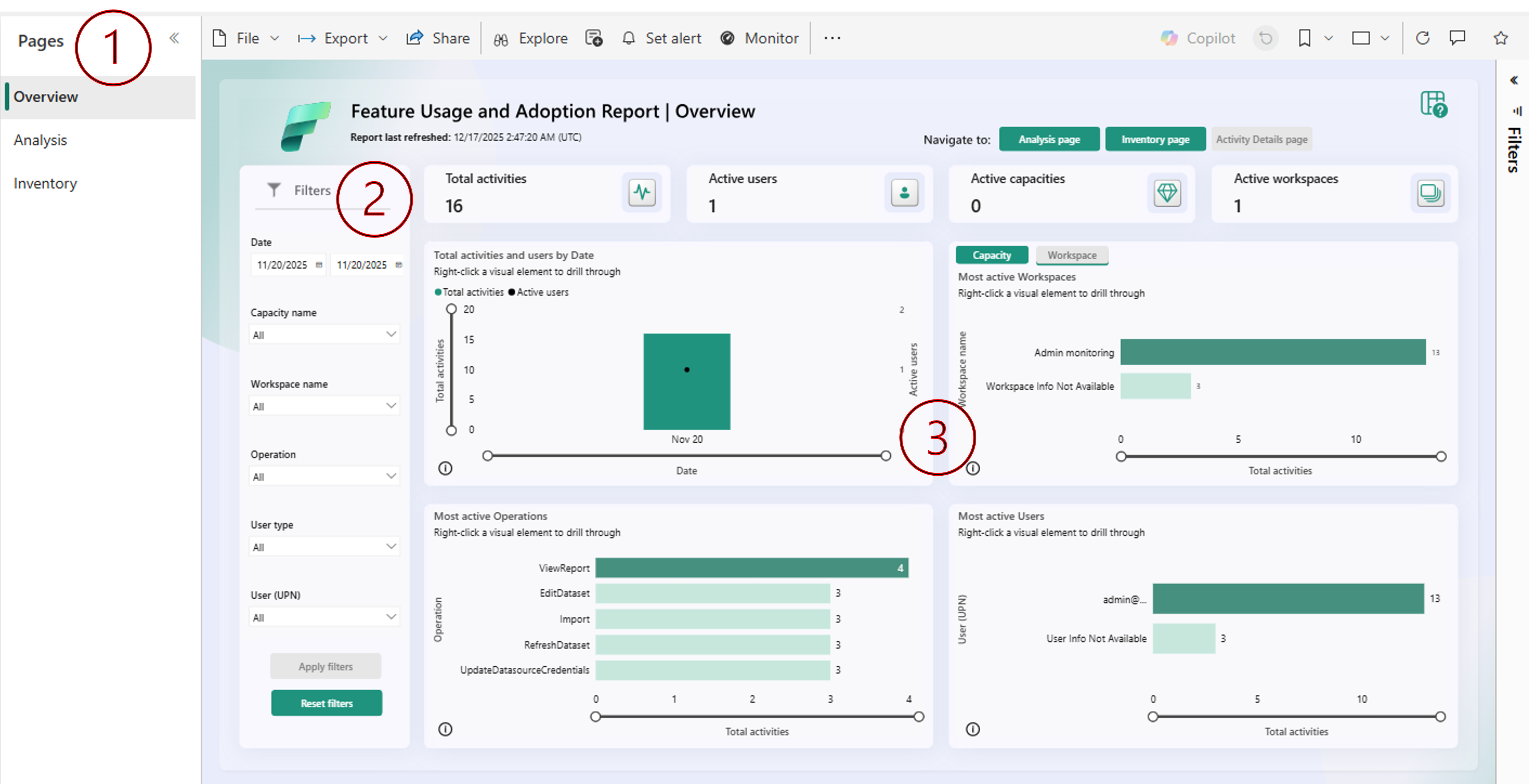 - Фильтры — указание диапазонов дат и применение фильтров для анализа действий Fabric на основе различных характеристик.