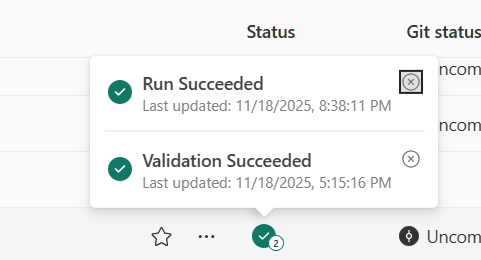 В рабочей области также можно получить общие сведения о состоянии всех потоков данных в рабочей области. это доступно через столбец "Состояние " в представлении рабочей области. Этот столбец предоставляет информацию о состоянии последнего обновления вашего потока данных, а также о времени последнего сохранения и проверки изменений. Если одно из этих действий завершилось сбоем, вы увидите красный восклицательный знак. Чтобы получить дополнительные сведения о сбое, наведите указатель мыши на значок.