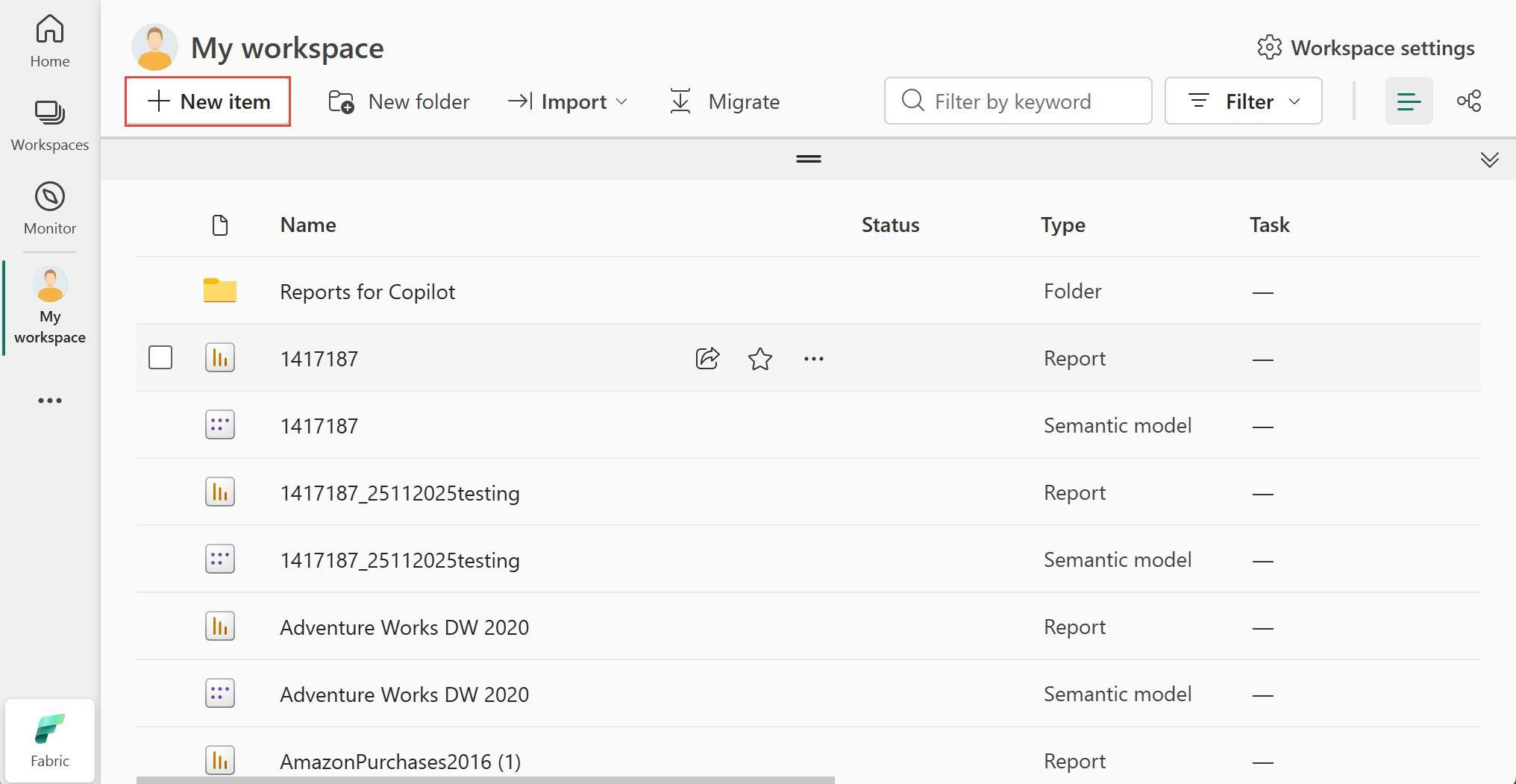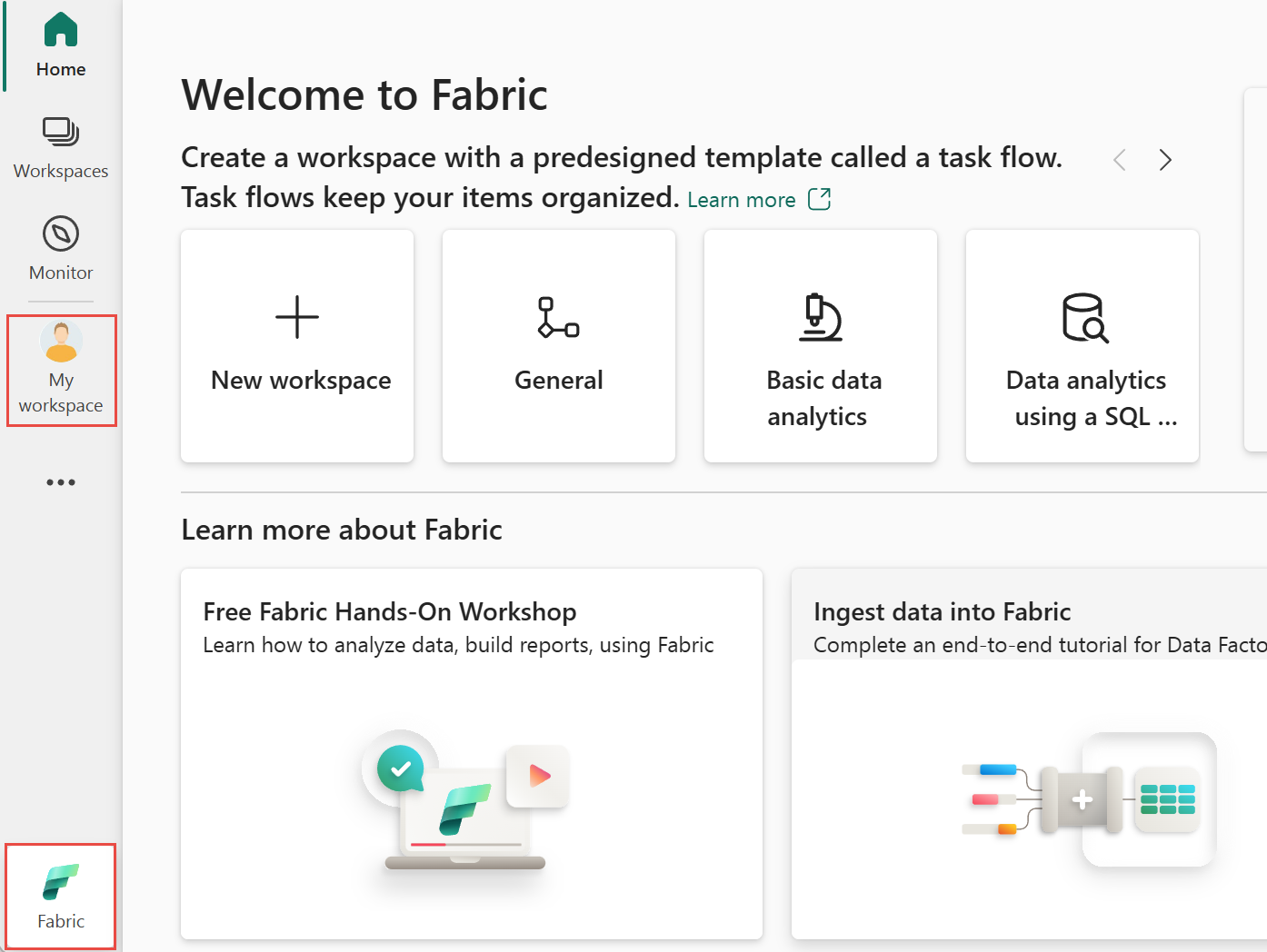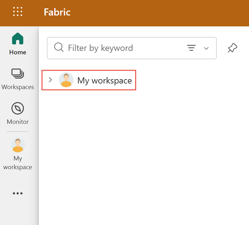 На портале Fabric переключитесь на интерфейс Fabric при необходимости и выберите "Моя рабочая область".